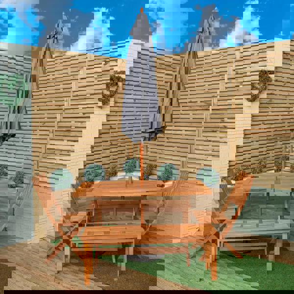 The set includes a wooden, rectangular table with 2 wooden, benches, a grey parasol and parasol base. An outdoor wooden patio table set brings a unique blend of elegance, comfort and practicality to your outdoor space. The texture and colour of the wood can blend seamlessly with natural surroundings that enhances your outdoor experience. Finished with teak oil, the design of the table features a slatted table top with a parasol hole and the backless benches are a simplistic yet contemporary style with a modern slatted wood.