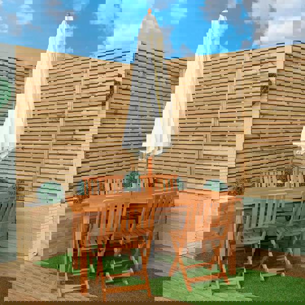 The set includes a wooden, rectangular table with 6 wooden, folding chairs, a cream parasol and parasol base. An outdoor wooden patio table and chairs set brings a unique blend of elegance, comfort and practicality to your outdoor space. The texture and colour of the wood can blend seamlessly with natural surroundings that enhances your outdoor experience. Finished with teak oil, the design of the table features a slatted table top with a parasol hole and the chairs are a simplistic yet contemporary style with a modern slatted wood. When not in use the chairs can be easily folded down and stored away.