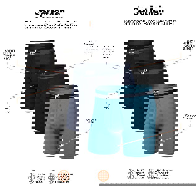 Anti-roll silky smooth 1½" branded waistband and with a structured fly access and a classic 6" inseam leg length with independent gusset for unrestricted movement. Includes the immortal BallPark Pouch™ now with the StopDrop fabric technology to help with unforeseen issues, that exists across all the SAXX® collection. Seam free centre back so no seam interference at all and what seams there are are FlatOut Seams design unique to the SAXX range.