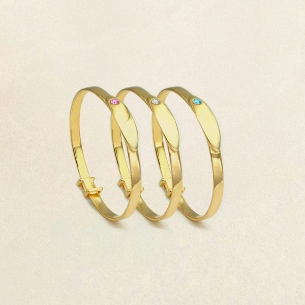 This elegant Baby Engraved Clear Stone Bangle in Yellow Gold is crafted from high-quality Sterling Silver and coated in a luxurious layer of 18k yellow gold. This bangle brings a touch of grace and shine to every little wrist. Featuring a petite plate with a clear CZ stone allows for personalized engraving of up to 8 characters, making it a unique keepsake. Thoughtfully designed, this bangle is a perfect gift for christenings, birthdays, or any special moment to cherish forever.