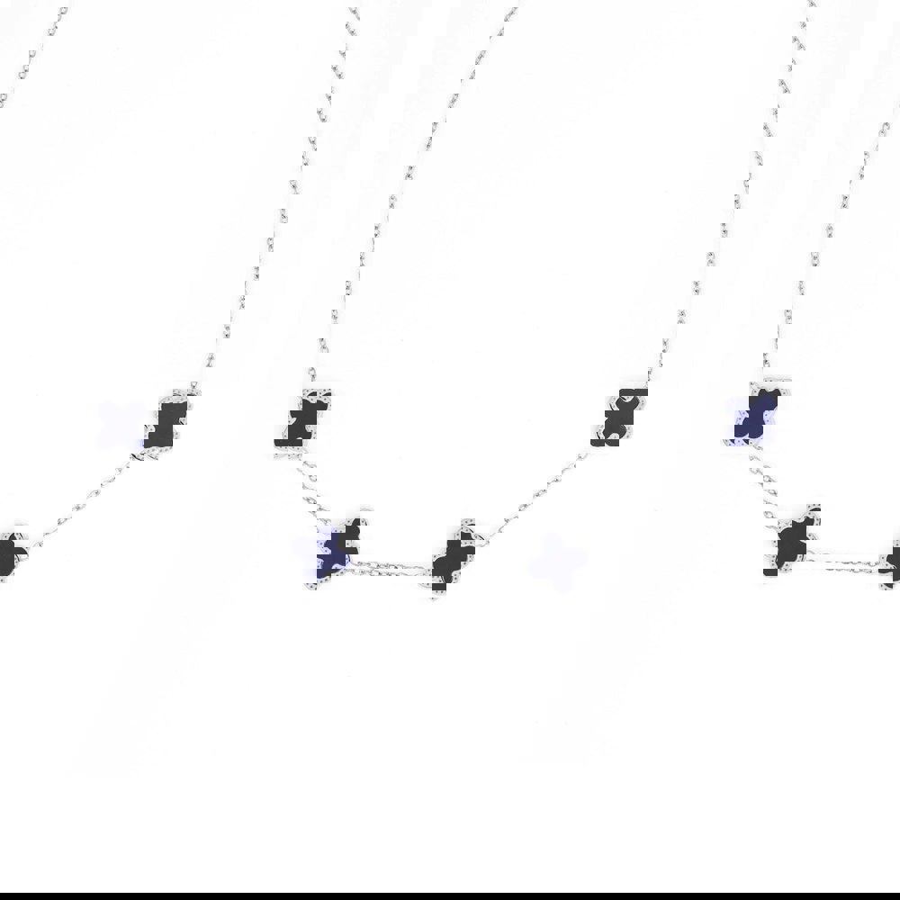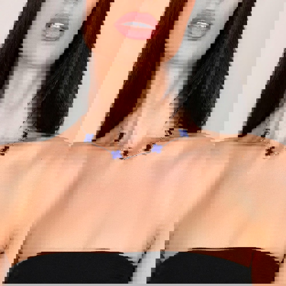 This dainty choker-style necklace features four double-sided blue clover pendants spaced evenly along the chain. Each clover adds a touch of colour and symbolizes luck, making this necklace both meaningful and effortlessly stylish.