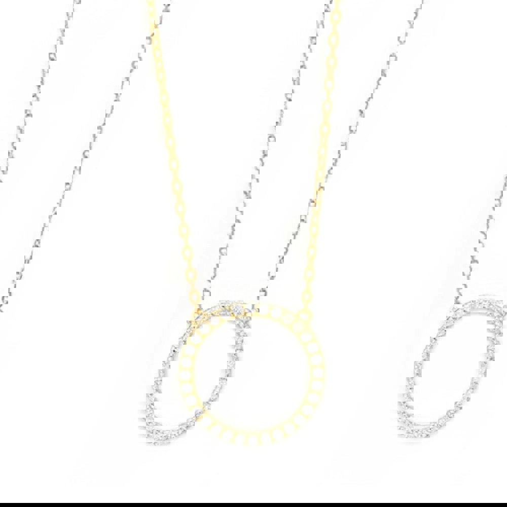 This sterling silver 18ct yellow gold plated Circle of Life Necklace features a striking circle pendant with cubic zirconia stones on 14-inch chain with the option to extend to 16-inch.