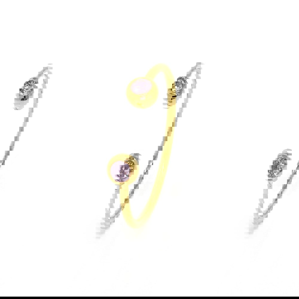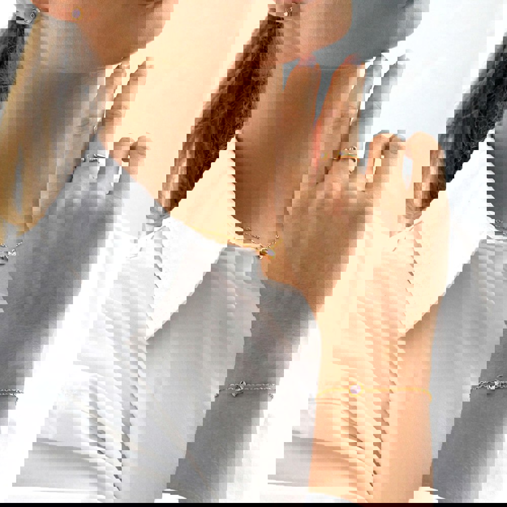 The Dainty Bezel Ring is crafted from stainless steel, meaning it is waterproof and anti-tarnish, and features two dazzling pink CZ stones.