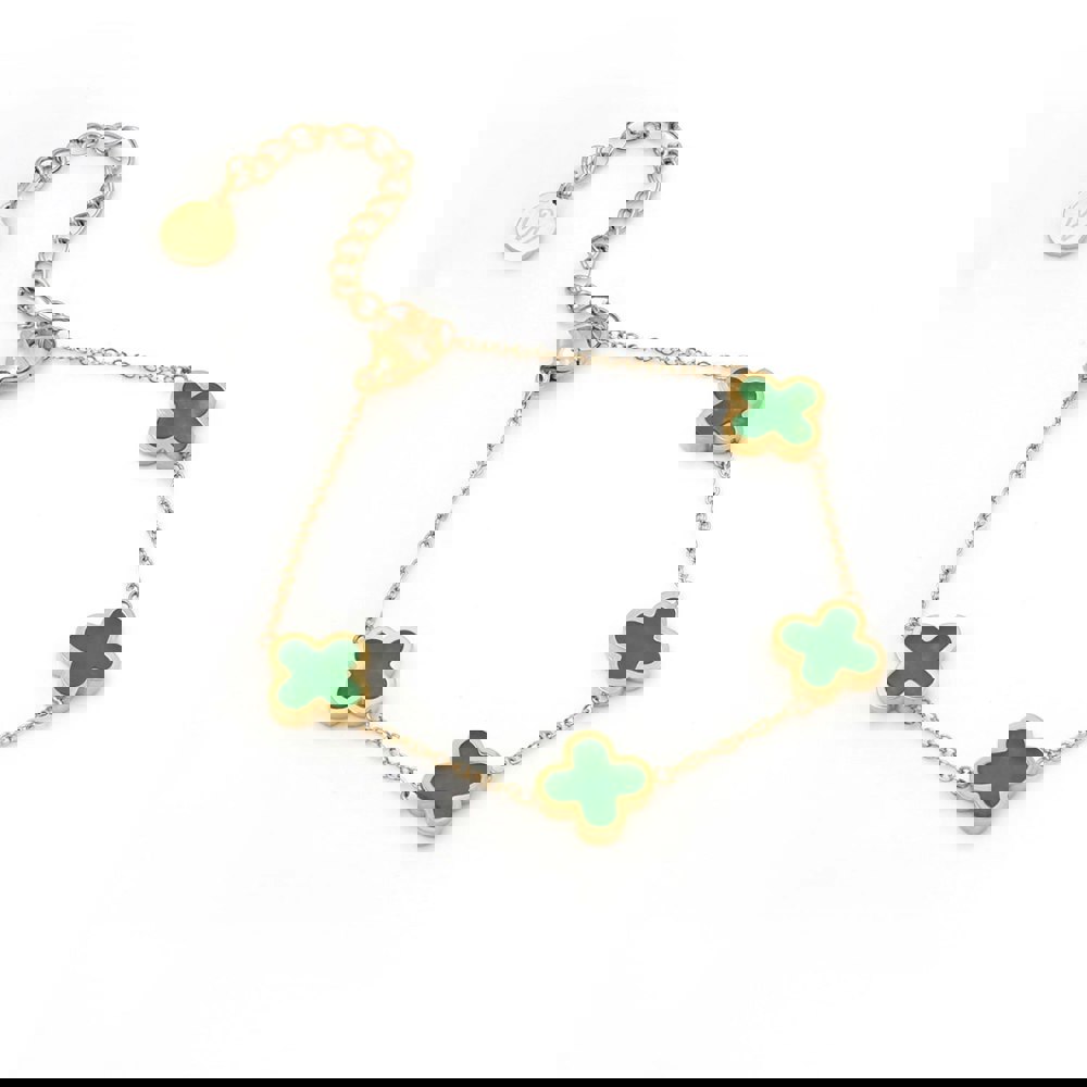 Bring effortless elegance to your look with the Green Crystal Clover Bracelet in Yellow Gold. Expertly crafted from stainless steel and plated in radiant yellow gold, this bracelet showcases a delicate clover charm, highlighted by a vibrant green crystal that catches the light with every movement.