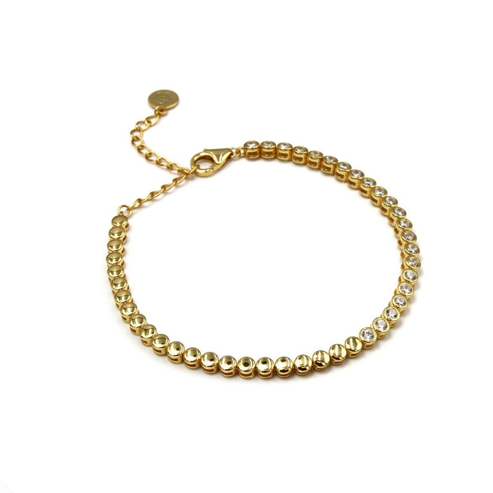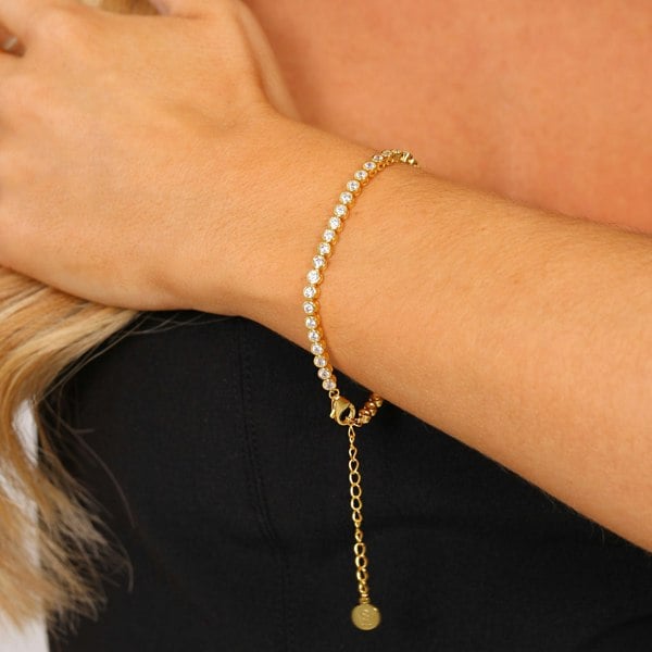 This beautiful Luxe Half Tennis Bracelet in Yellow Gold features cubic zirconia stones in a 18ct yellow gold plating on a sterling silver bracelet.