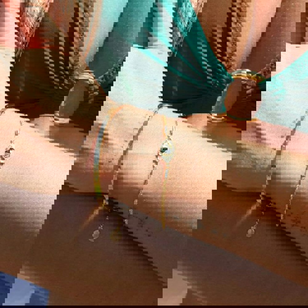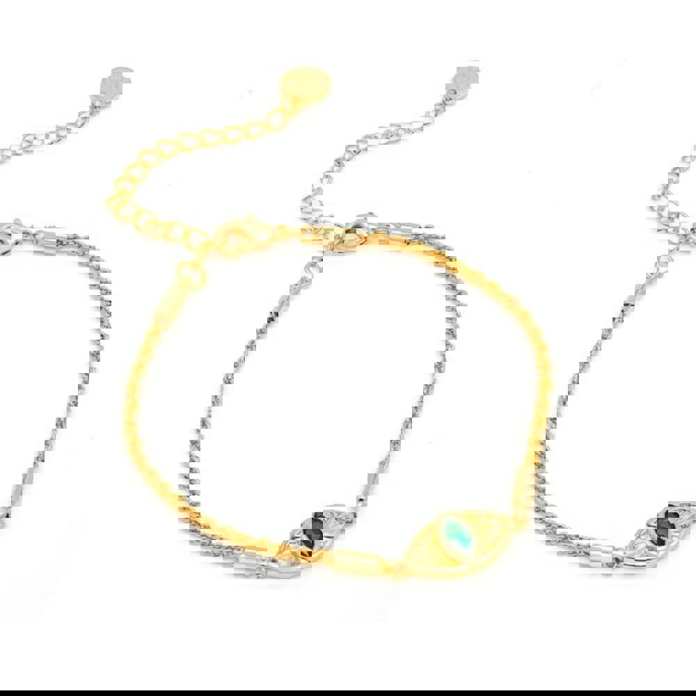An evil eye pendant sits at the centre, detailed with a marquise-cut cubic zirconia stone. Wear it solo for a clean statement or layer it alongside other bracelets for a more personalised mix.