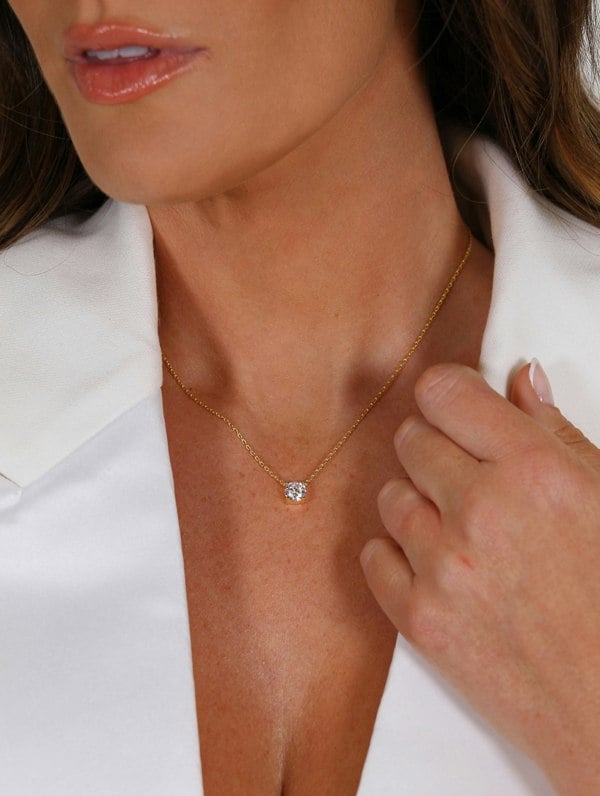 Shop the Round Gold Necklace, featuring a dazzling CZ feature stone attached to a stunning yellow gold plated chain.