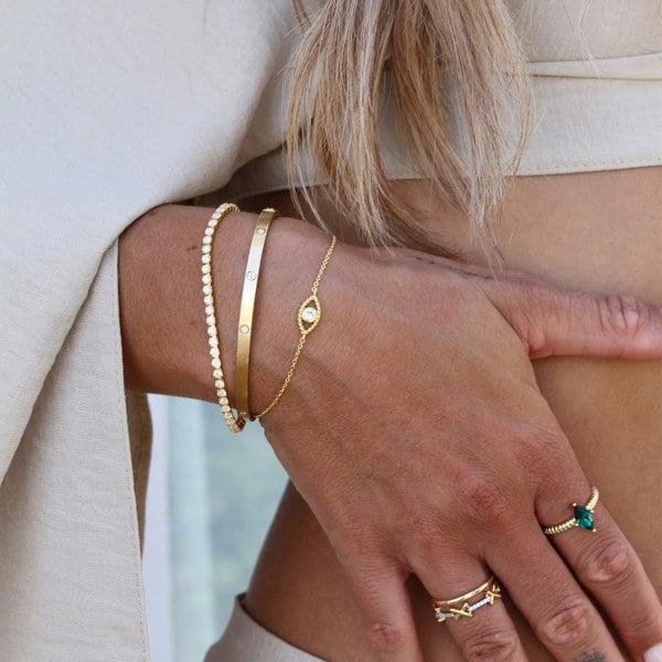 Crafted from sterling silver and yellow gold plated, this stunning bracelet is adorned with sparkling CZ stones for that added special touch.
