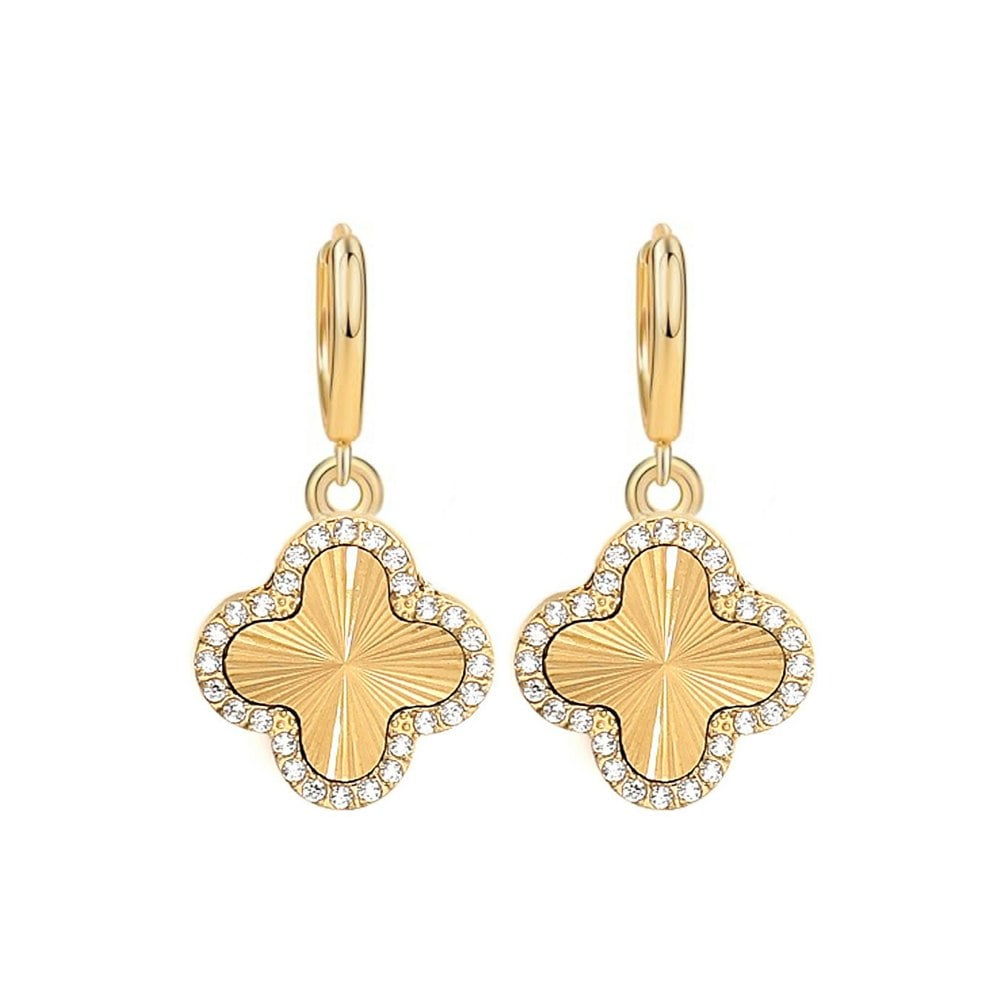 Expertly crafted from high-quality stainless steel and finished with a luxurious yellow-gold plating, these earrings offer both durability and lasting shine. The clover pendant is beautifully outlined with sparkling round cubic zirconia stones, creating a refined shimmer that catches the light from every angle.