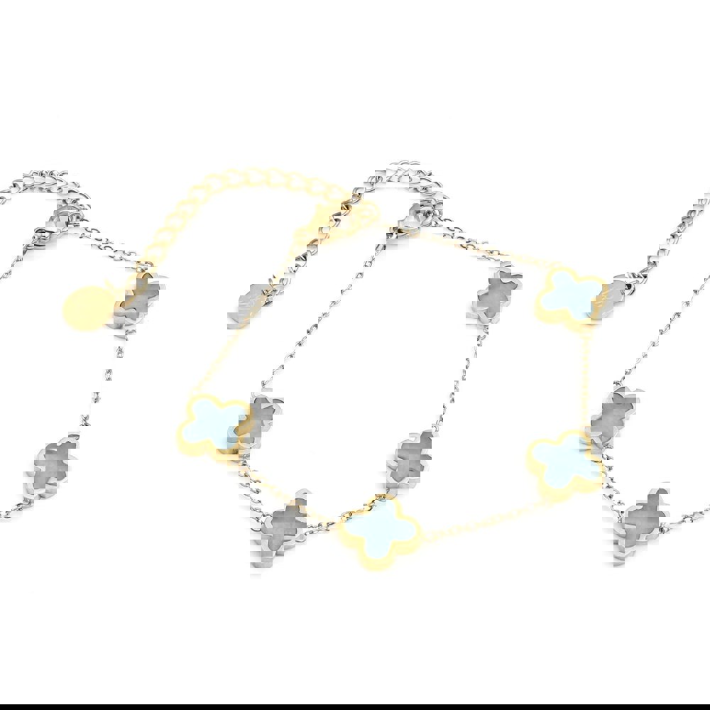 Plated in glowing yellow gold, the 8-inch chain is adorned with four elegant clover pendants, each featuring a genuine turquoise crystal at its heart. Celebrated for its calming properties and symbol of protection, turquoise brings a fresh pop of colour and deeper meaning to this radiant design.