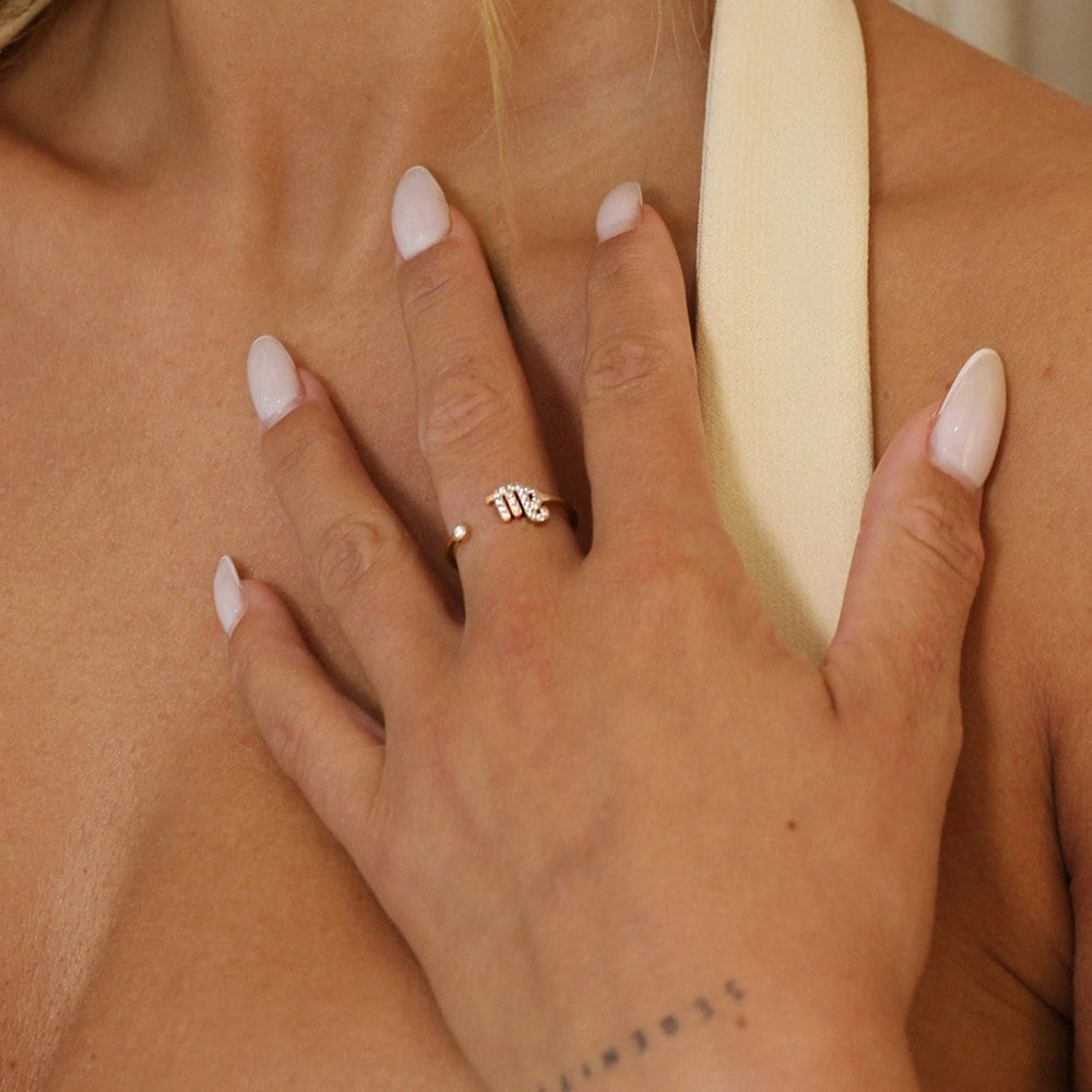 This stunning Virgo Ring in Rose Gold is crafted from stainless steel and features dazzling CZ feature stones on an adjustable ring.