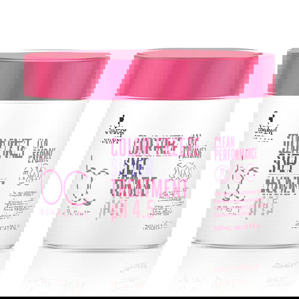 Schwarzkopf BC Clean Color Freeze Silver Treatment provides in-depth care for up to 95% less hair breakage. Neutralises any unwanted warm undertones. Specially formulated for grey and lightened hair. Hair is restored to its optimal ph level of 4. 5 achieving 90% colour retention for up to 30 washes whilst freezing colour pigments.