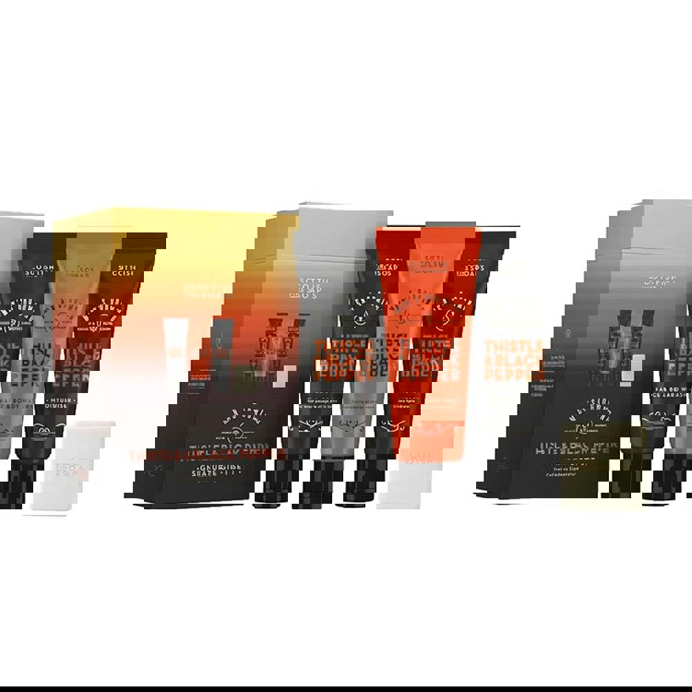 Infused with soothing milk thistle, this gift set includes the Thistle & Black Pepper Face & Beard Wash 75ml, Hair & Body Wash 75ml, Moisturiser 75ml and 40g Body Bar - leaving you feeling refreshed and refined with every use