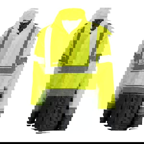 High visibility design for safer working. Protects from the cold, wind and rain, with full body padding and fleece-lined pockets. Concealed hood for neat storage when not in use. 100% polyester, 180gsm.