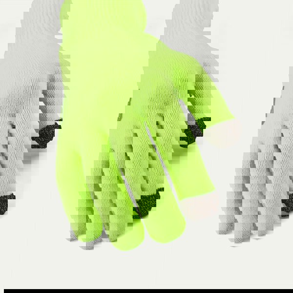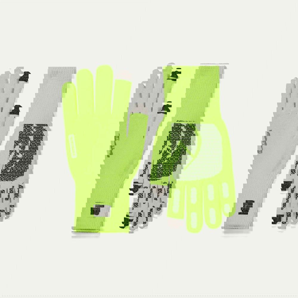 A light, waterproof knitted glove, ideal for use in the metropolis and the outdoors. Highly breathable. Instilled with a sticky, touchscreen compatible grip formation for added utility.