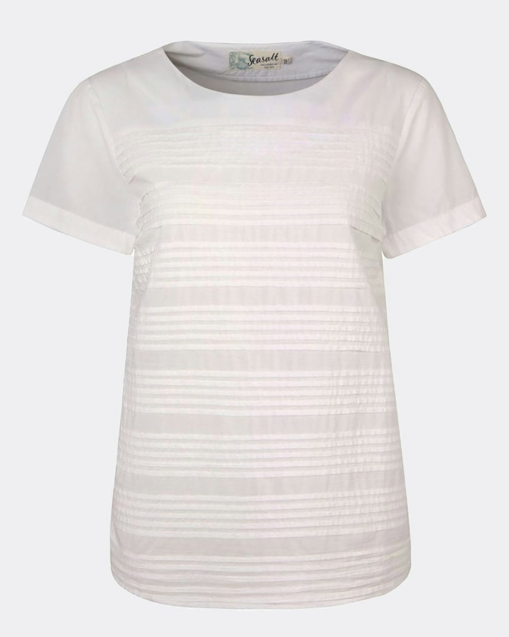 A fine cotton top with extra special details, perfect for relaxed days out at the weekend weekend. With stylish ruched bands that give a subtle stripe effect, a round neck and short sleeves, our Growan Top is great with jeans and looks super smart teamed with one of our colourful cardigans when you need an extra layer.
