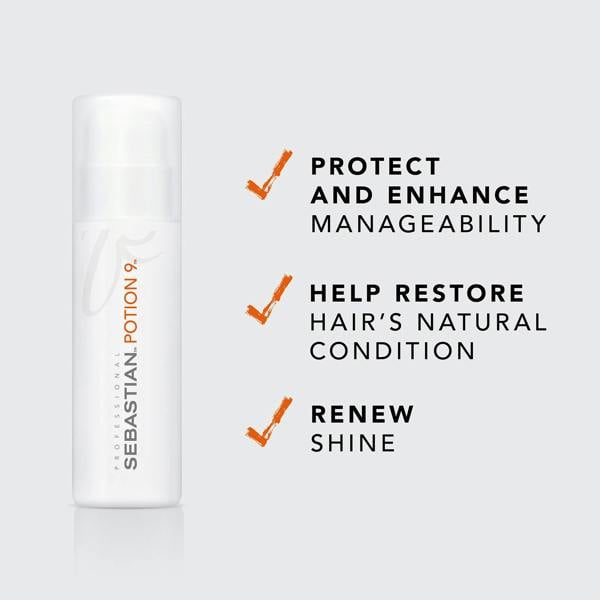 Balancing care and styling in one step, Sebastian Professional Potion 9 Wearable-Styling Treatment combines a conditioning formula with styling support. Active oil botanicals work within the conditioning base to restore hair’s natural condition, while a protective agent cocktail supports manageable styling and renewed shine. The formula penetrates the cuticle tip to leave hair feeling richer, flexible and more malleable, with flexible strength for ongoing styling.