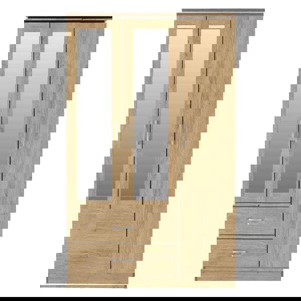 The Charles 3 Door 2 Drawer Mirrored Wardrobe adds style and functionality to any bedroom with its sleek oak-effect finish and elegant walnut trim. Featuring three doors and two roomy drawers, it offers generous space for clothes and accessories, while the mirrored panel brings light and a sense of space to your room.