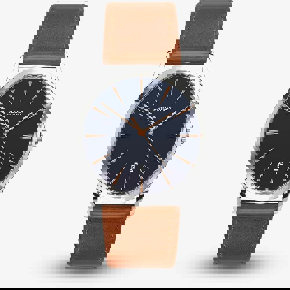 This watch has a dark blue analogue dial with two rose gold hands and second tracker. The date is visible at position 6 which is protected beneath mineral crystal glass. Power is generated by the quartz movement.