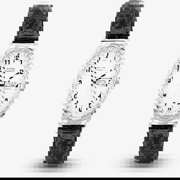 This timepiece featuring a sleek black leather strap paired with a crisp white dial. This elegant watch exudes timeless sophistication, blending versatile style with understated charm. Perfect for any occasion, its minimalist design ensures a polished look that never goes out of fashion.