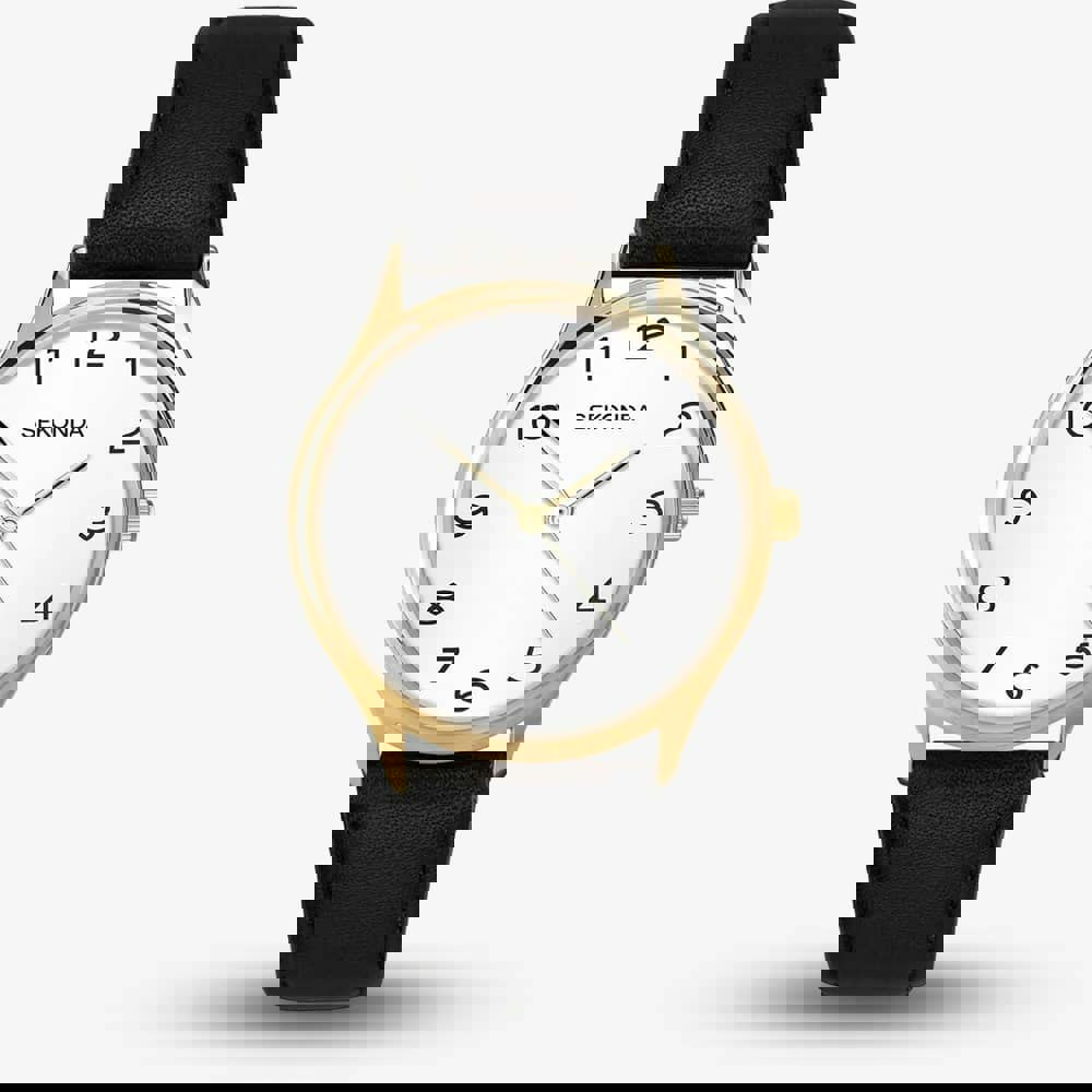 The sleek black leather strap offers both comfort and style, while the gold case adds a touch of luxury. With its understated charm and timeless design, this watch is sure to become a staple in your collection, effortlessly elevating your everyday look with a hint of refinement.