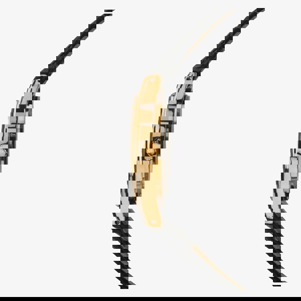 This is a classic timepiece featuring a black leather strap. The white face with black numerals makes the dial clear with a PVD gold plated case to add timeless elegance.