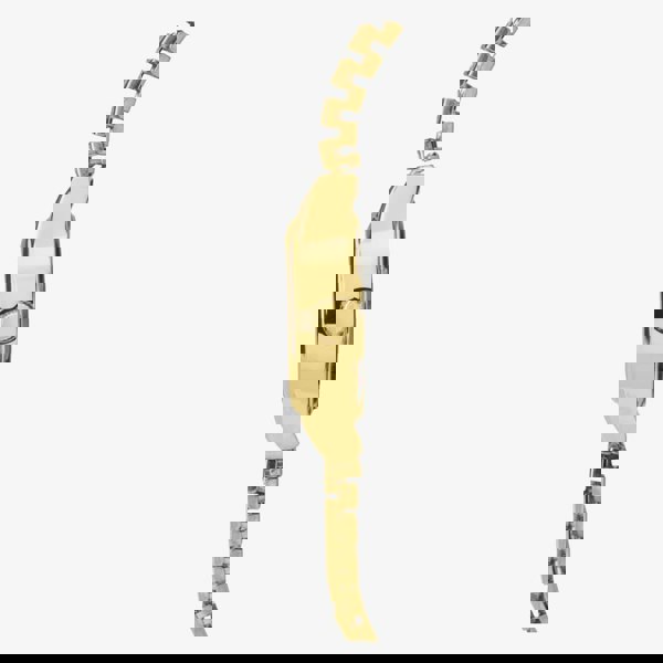 This elegant ladies gold tone watch features a slim design with an expandable bracelet for added comfort. This watch also has a simple white dial with bold black numeral markers.