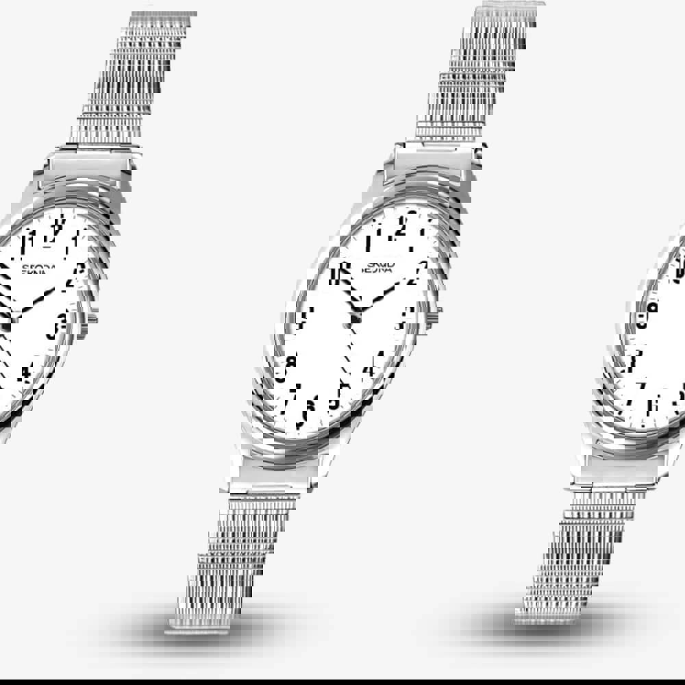This is a simplistic timepiece with a slim design in stainless steel. This Gents Sekonda watch features an expandable strap for comfort and a clear white dial with prominent black numeral hour markers.