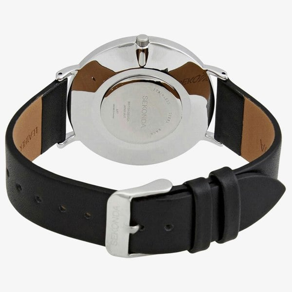 The Sekonda 1342 black strap watch features a sleek round stainless steel case and a striking white dial adorned with rose gold-tone hands and index hour markers, along with minute markers around the outer rim. Powered by a reliable quartz battery movement, this watch offers 30 m of water resistance, making it splash-proof for everyday wear. The black leather strap, measuring 20mm wide, fastens securely with a polished stainless steel buckle, combining style and functionality.