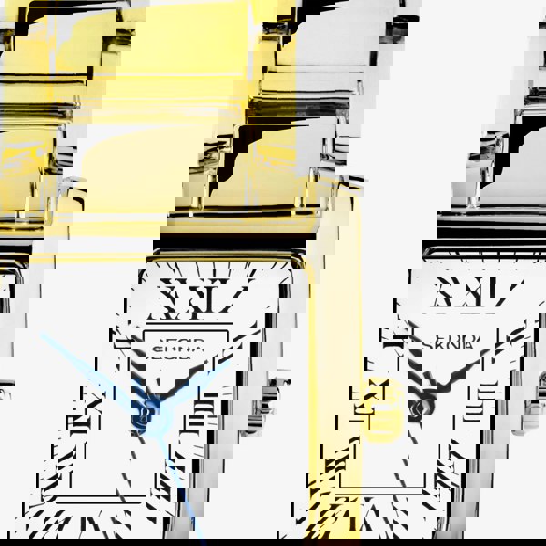 This watch features a rectangular, ion-plated gold alloy case with a white dial and Roman numeral hour markers. It is secured with an ion-plated gold alloy bracelet and a jewellery clasp.