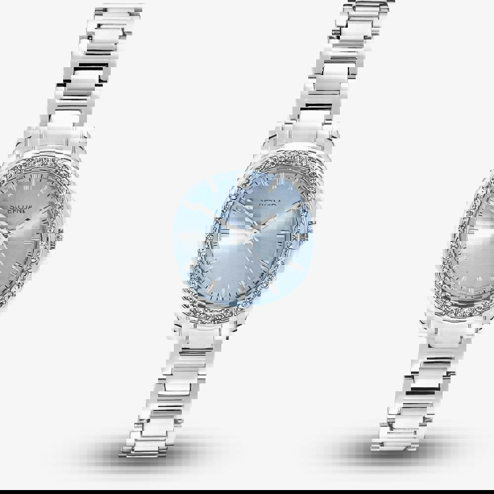 Chic, modern, and effortlessly versatile, this watch is designed to add a touch of understated elegance to any look. This sleek timepiece features a polished silver-tone case and matching bracelet that bring a refined edge to your style. The clean blue dial showcases minimalist hour markers and slim hands, creating a contemporary design that’s easy to wear from day to night. while the stone set bezel adds a touch of understated glamour.