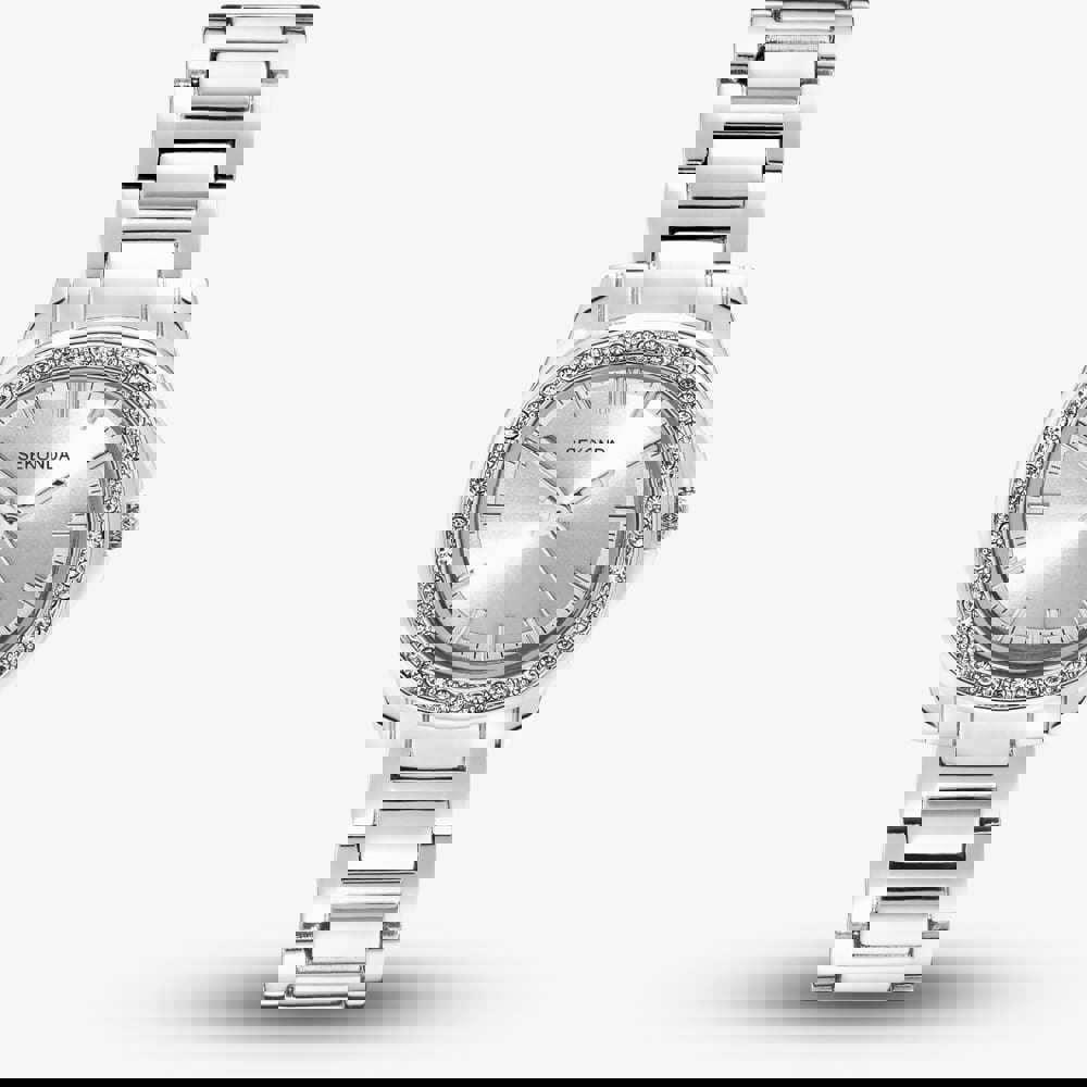 Chic, modern, and effortlessly versatile, this watch is designed to add a touch of understated elegance to any look. This sleek timepiece features a polished silver-tone case and matching bracelet that bring a refined edge to your style. The clean dial showcases minimalist hour markers and slim hands, creating a contemporary design that’s easy to wear from day to night. while the stone set bezel adds a touch of understated glamour.