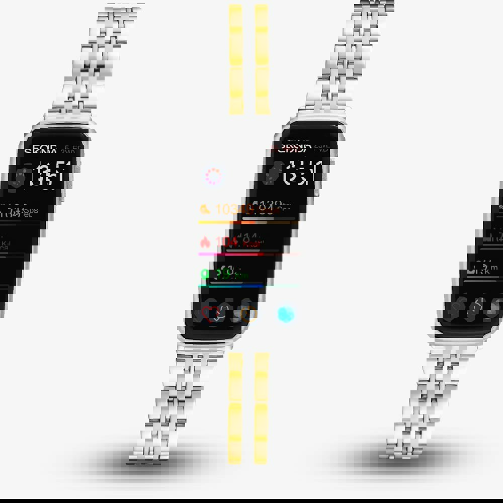 Stay connected, stylish, and on top of your goals with this smartwatch. Designed with modern living in mind, this sleek timepiece blends everyday functionality with chic design, making it the perfect companion for both fitness and lifestyle needs. With a stylish two tone design, this watch is both fashionable and functional.