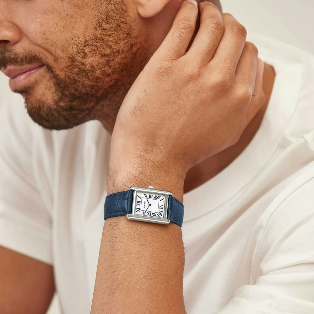 A perfect blend of classic design and modern elegance. Featuring a striking white dial with subtle detailing, this timepiece is complemented by a genuine blue leather strap for a sophisticated and comfortable fit. Its sleek stainless steel case adds durability while maintaining a refined look, suitable for both casual and formal occasions.