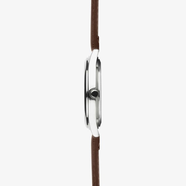The watch features a traditional analogue display with a clean and easy-to-read dial. Its design emphasises simplicity, making it suitable for both formal and casual occasions. A genuine brown leather strap provides a comfortable and sophisticated feel. The strap is designed for easy adjustment, ensuring a secure fit.