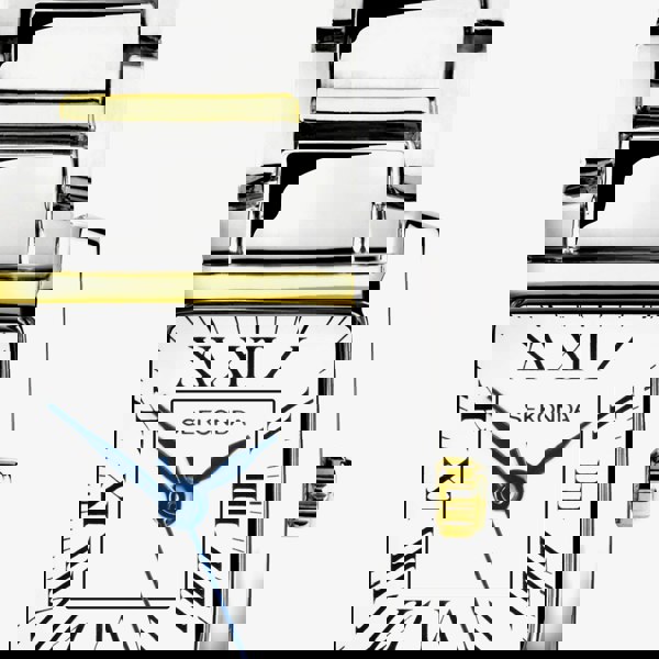 This watch features a rectangular, two-tone ion-plated gold and silver alloy case with a white dial and Roman numeral hour markers. It is fastened with a two-tone ion-plated gold and silver alloy bracelet and a jewellery clasp.