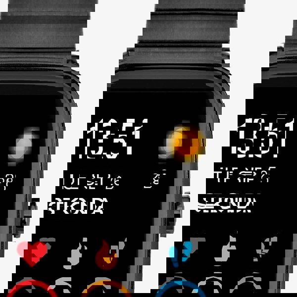 This watch boasts a black ion-plated alloy case with a 1. 83-inch rectangular fully interactive touch screen. It comes equipped with a step, distance, and calorie tracker, along with 15 sports modes, blood oxygen monitoring, Bluetooth calling, the ability to set frequent contacts, and the option to accept, reject, or dial calls directly from your watch. The watch is fastened with an interchangeable black ion-plated stainless-steel bamboo-style bracelet, complete with quick-release spring bars. With a water resistance rating of IP67, it's splashproof and showerproof, but not recommended for swimming or water sports.