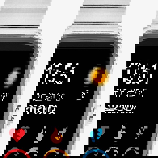 This watch features a silver ion-plated alloy case with a 1. 83-inch rectangular fully interactive touch screen. It comes equipped with a step, distance, and calorie tracker, along with 15 sports modes, blood oxygen monitoring, Bluetooth calling, the ability to set frequent contacts, and the option to accept, reject, or dial calls directly from your watch. The watch is fastened with an interchangeable silver ion-plated stainless-steel bamboo-style bracelet, complete with quick-release spring bars. With a water resistance rating of IP67, it's splashproof and showerproof, but not recommended for swimming or water sports.