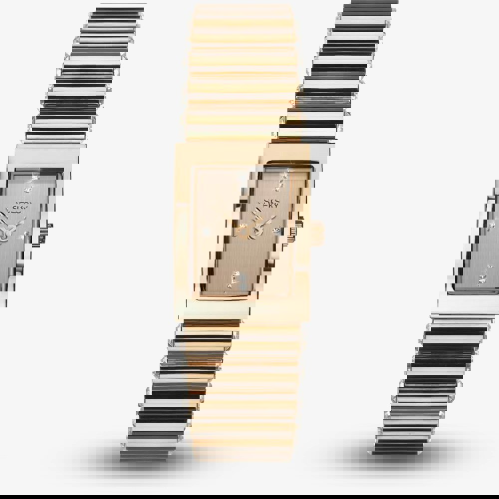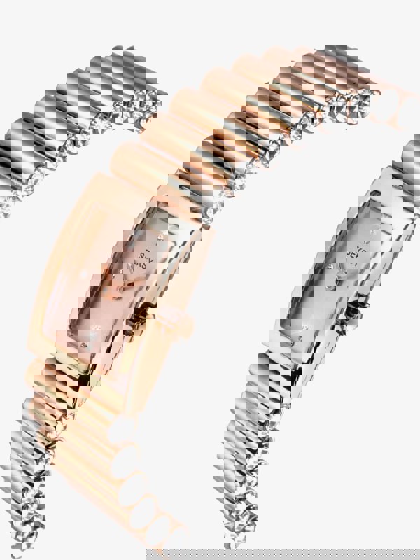The timepiece features a rectangular rose gold plated case surrounding a sleek rose gold stone set dial. The piece is fastened with a rose gold plated stainless steel bracelet that is beautifully embellished with swarovski crystals.