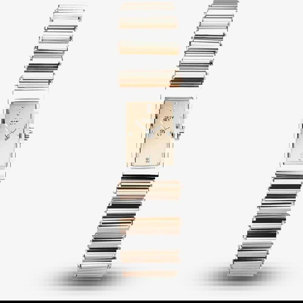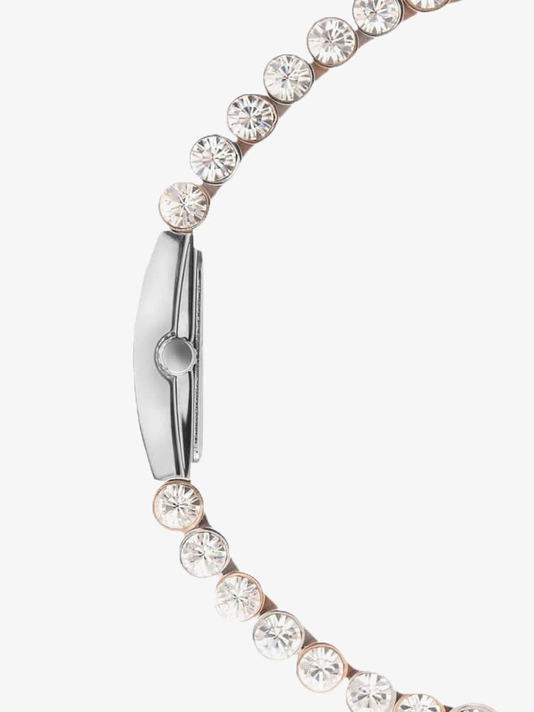 This Seksy timepiece is perfect for working this seasons mixed metal trend. The watch is crafted with a two colour silver and rose gold tone design with a contrasting gold dial. The dial is also embellished with crystal set indexes and stainless steel hands. The bracelet is the watch is adorned with sparkling white swarovski crystals and is finished with a fold over clasp fastening for a secure fit.