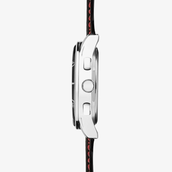 This sleek black leather strap watch featuring striking red stitching and a bold black dial. With its sophisticated design and classic colour combination, this timepiece is the perfect accessory for any occasion.