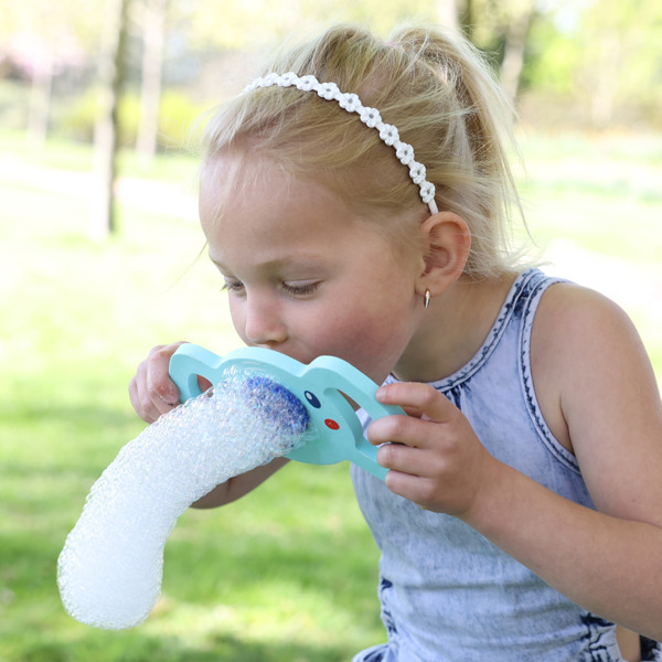 What happened to this cute elephant’s trunk? Grab his ears, dip his nose into the bubble solution, and blow!
