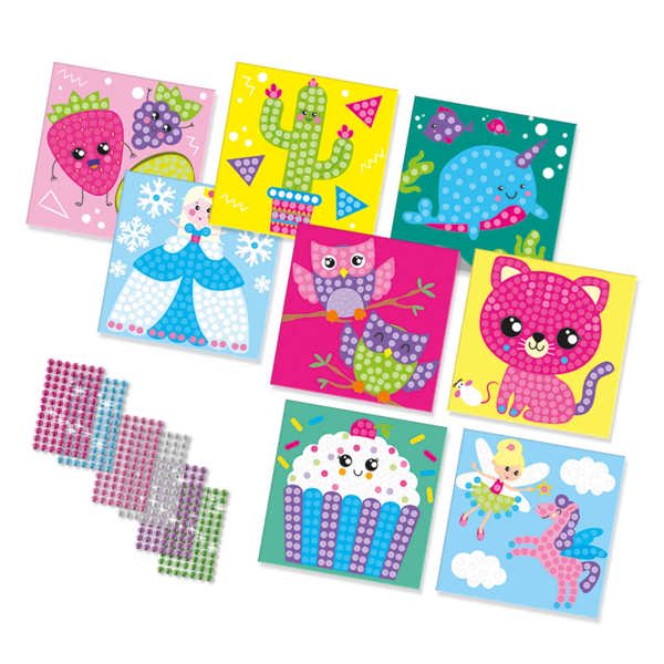 Diamond painting junior. The shiny diamond dots are self-adhesive and very easy to stick on the colourful cards.