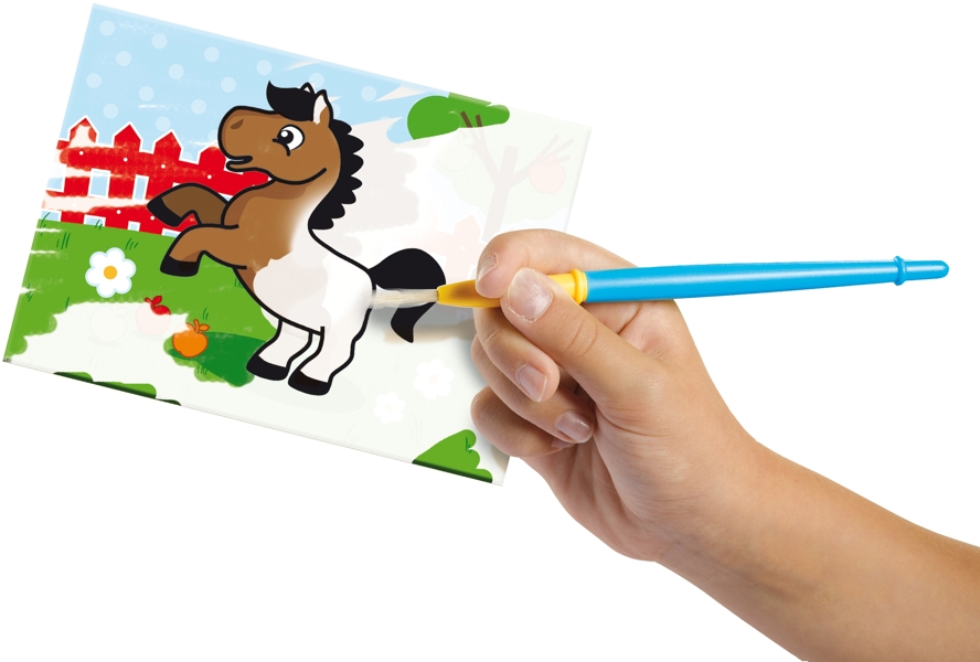 Magic with water and paint without the mess. It’s possible using this unique set by SES. Paint the card, there are 4 included, with a wet brush and watch the colour picture come to life. The brush is safe to use because the hairs cannot fall out. Reusable after drying. Suits ages 1 year plus
