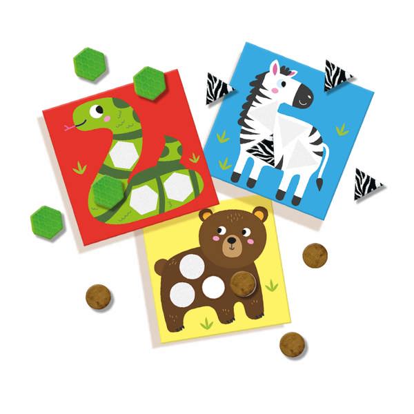 Oops, these six animals are missing part of their fur. Will you give them their coats back by placing the shapes with the different types of fur in the right places? Does the bear have soft or rough fur. Discover them all! By removing the top layer of the mosaic shapes, you can easily stick them onto the cards.