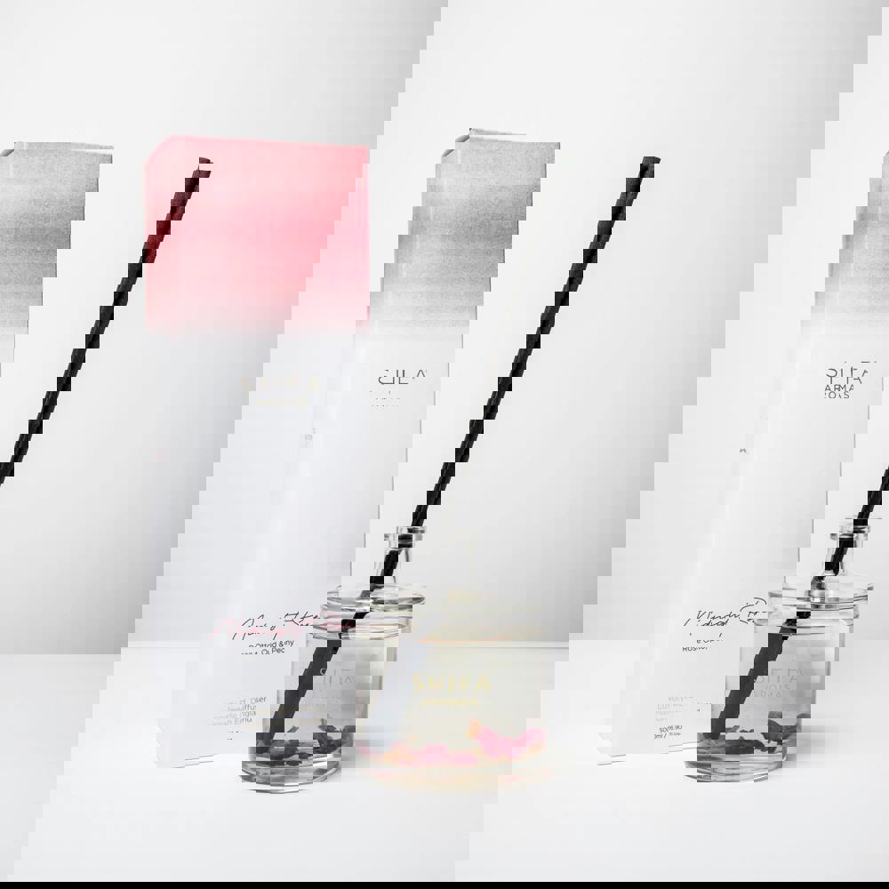 The calming blend of Mandarin, Rose Otto, and Lily gently transports you to a serene place, while the warm, spicy floral notes of Musk, Amber, Oud, and Patchouli elevate your spirit, inspiring passion and indulgence. The luxury reed diffuser is infused with Peony petals & Oud wood.