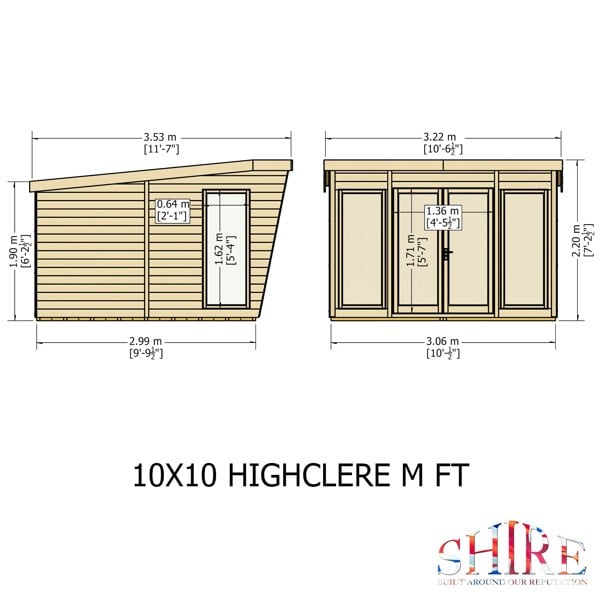 Width (mm) 3064 Depth (mm) 2990g Ridge Height (mm) 2196 Eaves Height (mm) 1898 Roof Material 12mm Ply Floor Material 12mm Matching Wall Type 12mm Shiplap Framing (mm) 44x44 Lock Type mortice lock Window Quantity 4 Glazing Material acrylic Door(s) Double