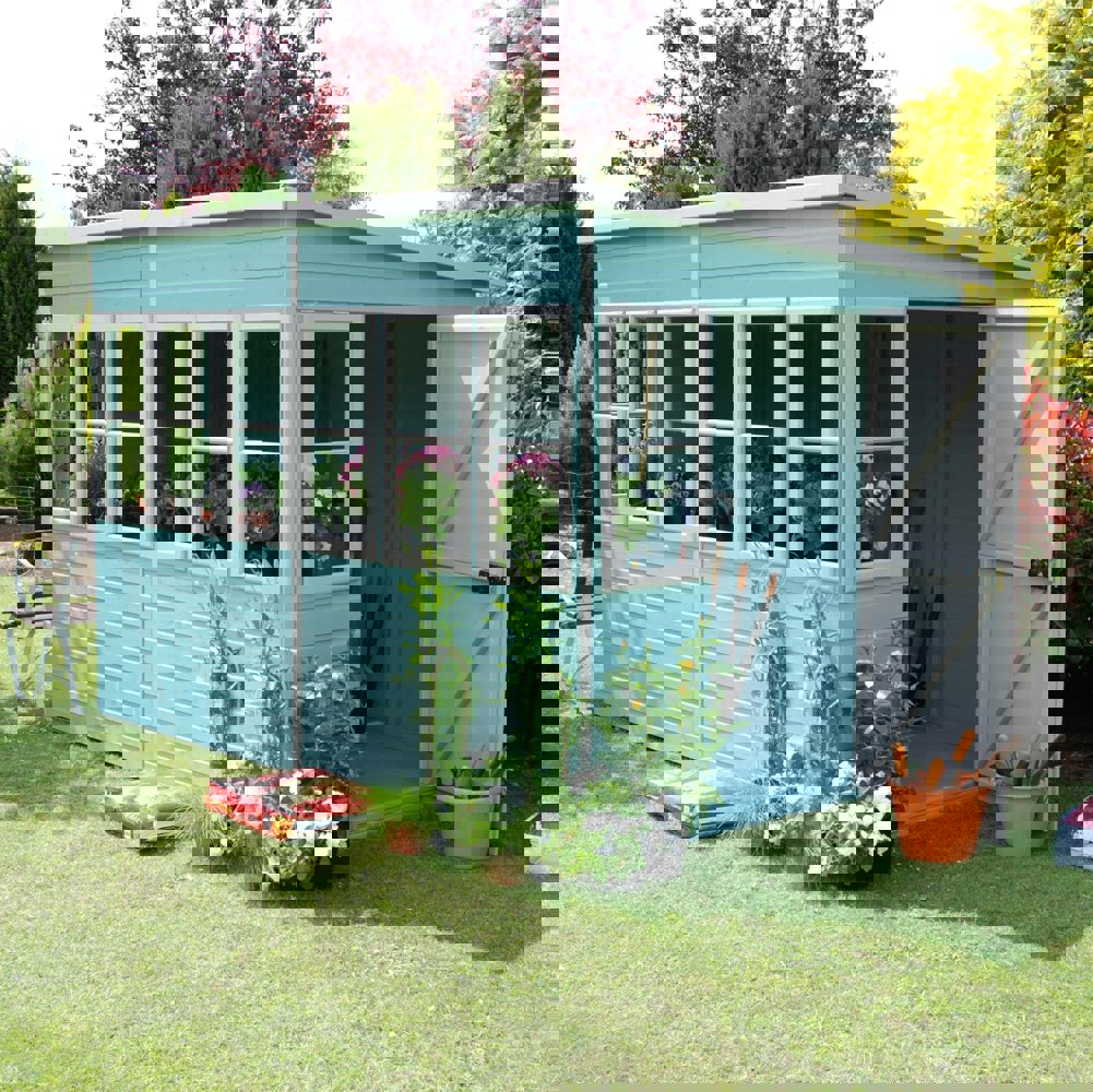 The 8x8 Sun Pent Potting Shed with double doors, now available on Shire, is your ultimate gardening partner. Tailored for the gardening enthusiast, it not only offers substantial storage space but also features glass windows to create an ideal environment for potting plants and starting seedlings. The symmetrical lines of the pent roof lend a modern and sleek appearance, making it a stylish addition to any garden. This product blends robust functionality and aesthetic appeal, perfect for those keen on maintaining a vibrant outdoor space.