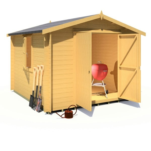 Width (mm) 2990 Depth (mm) 2990 Ridge Height (mm) 2360 Eaves Height (mm) 1943 Roof Material 12mm T&G Floor Material 12mm T&G Wall Type 19mm log Framing (mm) n/a Lock Type pad bolt Window Quantity 1 Glazing Material Glass Door(s) 1 double