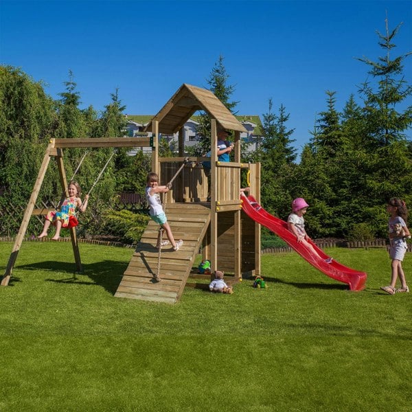 Featuring a raised tower platform with Climbing wall, Slide, Swing and rope climb for endless fun!